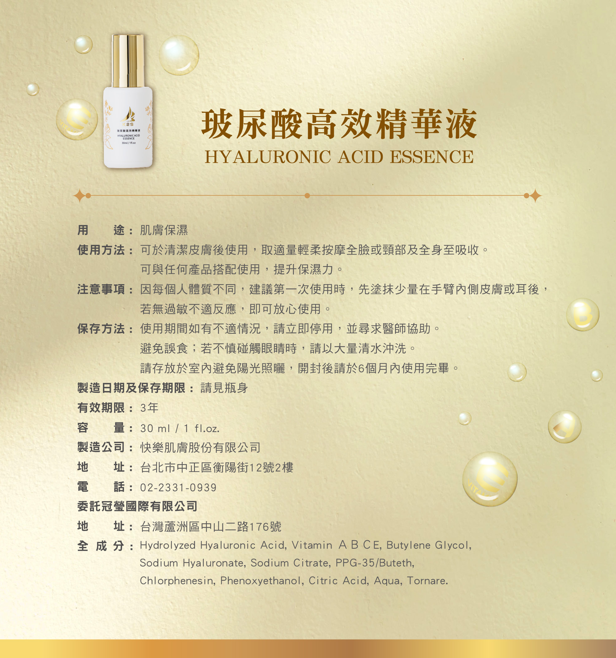 除原有添加保護皮膚抗氧化維他命E調製為高濃度玻尿酸精華液外,
